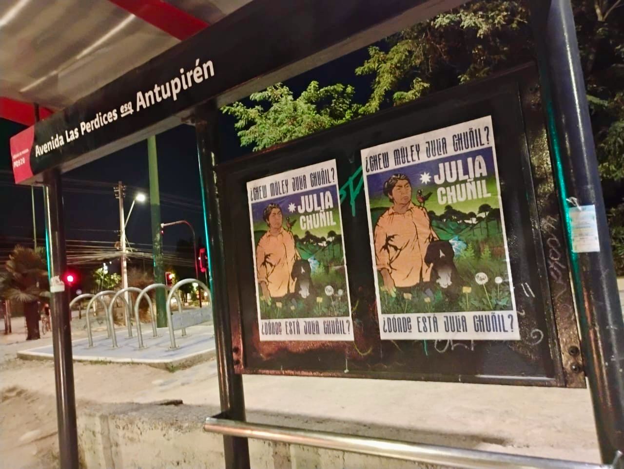 Luego de algunas participaciones en las convocatorias de verano en Plaza de la Ciudadanía en donde se ha exigido más acciones para encontrar a Julia Chuñil, el mes de la mujer se cruza en los temas de desigualdades que tienen las mujeres frente a la impunidad de justicia y protección de derechos frente a su condición de género, lo que sumado a ser indígena y del mundo rural, más su lucha medioambiental, ha demostrado que no ha sido prioridad encontrarla, ni saber de su destino. Con la justa razón de seguir insistiendo en sumar más esfuerzos para conocer su desaparición, la coordinadora Viviana Sepúlveda y gracias a los apoyo de otras organizaciones difundieron carteles elaborados con la imagen diseñada de Pititore, sobre su búsqueda en distintos lugares de la ciudad.